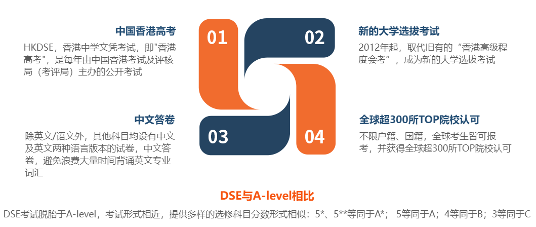 香港中学文凭考试(HongKong Diploma of Secondary Education Examination),缩写为HKDSE,简称DSE考试,是香港教育局于2012年3月起在新学制体系下建立的大学入学选拔考试,由香港考试及评核局(考评局)组织,也被称为“香港高考"是可用中文答题的国际考试。任何国籍的学生均可通过DSE考试申请香港及海外的大学,香港户籍的学生,也可凭 DSE 成绩免试入读内地的大学。